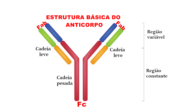 Um anticorpo é tipicamente constituído por unidades estruturais básicas, cada uma das quais com duas grandes cadeias pesadas e duas cadeias leves de menor peso molecular. A molécula de anticorpo tem forma de Y; as extremidades dos braços do Y são o fragmento Fab por onde se ligam ao antígeno; o pé do Y é o fragmento Fc. As moléculas dos anticorpos podem aparecer em separado, como monómeros, ou associarem-se entre si formando dímeros com duas unidades ou pentâmeros com cinco unidades. Os anticorpos são sintetizados por um tipo de leucócito denominado linfócito B ou célula B.