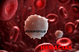 Eosinófilos. A primeira imagem é de uma célula eosinofílica de uma lâmina corada com H/E. A segunda imagem do Google, é da imagem feita por micróspio eletrônico de varredura M/E, de um eosinófilo.