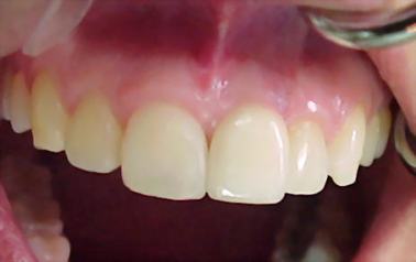 Esta fotografia mostra uma arcada dentária superior onde os dentes e os tecidos gengivais estão perfeitamente normais. Nesta arcada existem dentes e um implante. É possível ao profissional identificar ambos. Contudo, uma reconstrução como essa, onde o osso foi regenerado, após a extração de um dente, pois sua raiz estava perfurada é um sucesso para o paciente, nos aspetos estéticos, funcionais ou mesmo psicológico. Acreditamos ser um sucesso da integração entre as várias especialidades presente na odontologia.