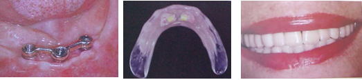 Nesta paciente foram realizados três implantes inferiores anteriores, para fixação de uma verdenture. Na segunda fotografia a dentadura com os clipes de fixação. Na última a prótese colocada, satisfazendo a estética e função da paciente.