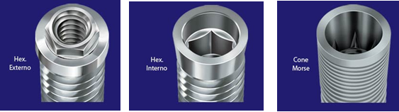 Estes são os três tipos básicos de implantes dentários conforme sua plataforma: Hexágono Externo, Hexágono Interno e Cone Morse. Estas plataformas apresentam alguns aprimoramentos técnicos, para propiciarem mais segurança para uma osseointegração efetiva e para a colocação precisa dos componentes protéticos. Estas fotografias dos implantes maquinados antes do tratamento de sua superfície.