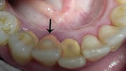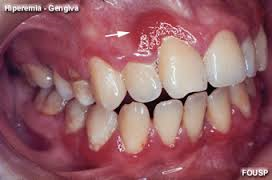 Na parte superior destes dentes vemos claramente uma Gengivite instalada. A gengiva fica, vermelha, lisa devido ao edema. As papilas ficam mais vermelhas e aumentam de volume e quando tocadas pelo fio dental sangram com facilidade.