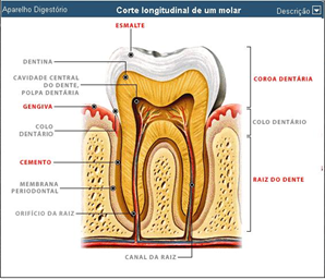 Todos estes detalhes procuraremos, esclarecer, no decorrer deste trabalho nos casos clínicos, que apresentaremos, esse importante assunto será melhor esclarecido. O DENTE: Importantíssimo considerar que o dente não é apenas uma peça dura, mineralizada, introduzida no osso. O dente é um órgão complexo, formado embriologicamente, a partir de tecidos epiteliais e conjuntivos, que se histodiferenciam, formando um complexo órgão para a mastigação. Como vemos no esquema: Ele é aderido por fibras ao tecido epitelial. É preso ao osso alveolar, por uma membrana muito complexa, chamada de ligamento periodontal, que além de fixar o dente no osso, tem células de defesa, células de reconstrução e destruição óssea, vasos sanguíneos e nervos com terminações ditas proprioceptivas, ligadas ao Sistema nervoso, que nos orienta a todo momento na mastigação e na postura de nossa oclusão. O dente em si é recoberto em sua coroa pelo esmalte, que é de origem epitelial, ele é um cristal sólido, a todo momento troca íons com a saliva, mantendo sua integridade. Se não houver saliva, (paciente irradiados), o esmalte é o primeiro a desaparecer. O Flúor é o elemento que dá maior resistência aos tecidos duros dos dentes. Abaixo do esmalte, formando todo arcabouço do dente tem a dentina, que é de origem mesenquimatosa, e possui canalículos com prolongamentos de suas células, que lhe deram origem os Odontoblastos. Na parte mais interna temos a polpa dentária, é um tecido vivo, conjuntivo, com vasos, nervos e todos tipos de células conjuntivas. Cemento, é de origem conjuntiva, e recobre as raízes dos dentes, têm a função de fixar as fibras conjuntivas do ligamento periodontal. Assim estas fibras pendem-se ao osso alveolar e ao dente, fixando-o no alvéolo dental. Todos estes tecidos que formam o complexo sistema dentário, podem apresentar patologias, por exemplo: Na gengiva – Gengivite; no ligamento periodontal e osso – Periodontite (a mais grave das doenças); na polpa – pulpite. Essas patologias apresentam variações, dependentes da imunologia do paciente. Figura de um dente no alvéolo.