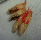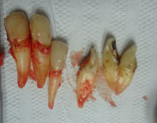 Todos dentes condenados tiveram que ser extraídos. As remoções foram feitas com muita cautela para não haver rompimento da crista óssea, assim como do septo interdental. Esse procedimento deve ser realizado em todas exodontias, para preservar o máximo de tecido ósseo alveolar.