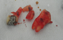 O dente foi removido com odontosecção de suas raízes, para não haver perda óssea, durante a extração. Todas as paredes dos alvélos foram curetadas e limpas, para inserimos o material aloplástico. O segundo molar, unirradicular foi extraído também.