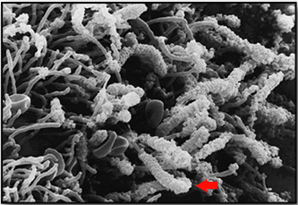 Desta maneira, didaticamente classificamos a Gengivite como uma inflamação onde não há perda óssea. Ela é episódica. Quando o processo inflamatório, evolui e inicia a perda óssea temos a fase de Periodontite. A seguir temos uma imagem do microscópio eletrônico de varredura, mostrando um biofilme, de uma periodontite inflamatório instalada, onde a seta aponta uma formação em “cornan cob” (espiga de milho), onde os cocos estão aderidos uma bactéria filamentosa. Segundo pesquisas a bacéria fundamental filamentosa nesta fase seria: Aggregatibacter actinomycetemcomitans (AA).